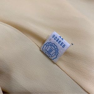 Very well made and in excellent condition. Recently dry cleaned after last wear. Only show of wear is on two of the three buttons as shown. Button pictures has the most wear. Interior liner looks like silk, but there is no fabric tag so I cannot confirm. Beautiful chartreuse color, first picture shows the true color.