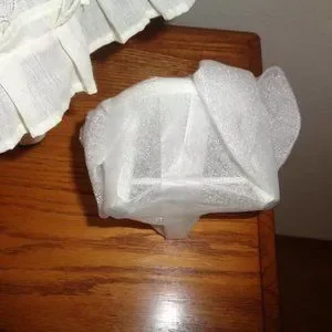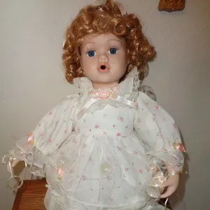 She is all dressed up in her pretty ruffled and laced dress with bows. Real eye lashes and she loves to pretend that she is blowing bubbles. ( She does not actually blow bubbles ) She is a collectible doll with a seat that comes with her. I personally don't think she sits on the seat very well but would still look very nice propped up on some pillows on a bed. She is not a toy to play with but rather to display. I am in my 60's and I still love to go out and blow bubbles with or with out my grand children. This doll is for the child at heart such as my self who just can't get enough of blowing bubbles and were always enchanted by all those pretty colors in them as the floated in the air. She is 15 inches tall, new and has been stored well. There is no original box but I will wrap with love for a safe trip to you. It is her head and half way up her arms and hands that are porcelain. The rest of her is cloth and stuffed tightly. She is a cutie for sure. Who can resist those pretty curls too???