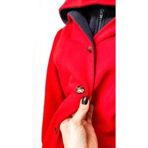 HOW TO STYLE/DETAILS: adorable 1980's union made hooded wool coat is SUPER warm due to the extra, attached navy wool layer directly under the red, buttoned shell. Pockets at the side, brown covered buttons down the front and adjustable drawstring hem. Color is a fun bright red and warm navy blue lining.