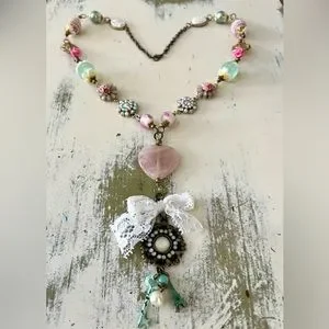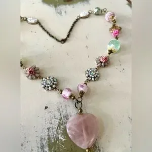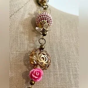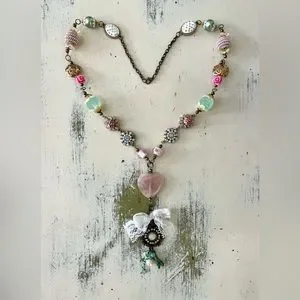 NEW!!! Pink heart stone necklace! Handmade and intricate design by myself. Blending hues of pink, green, and bling of course!! 🤩 This is my most detailed concept I have created to date! Includes butterfly beads and other specialty beads full of character and craftsmanship! Paired with gold and antique gold hardware! 🤩 Truly a unique gem 💎 Paired with matching earrings. Measurements coming soon! 🥰💗🥰