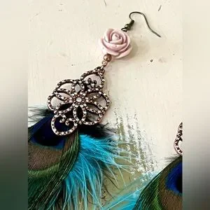 NEW!! Heart Pink Stone Necklace Peacock Earrings Set Handmade Design