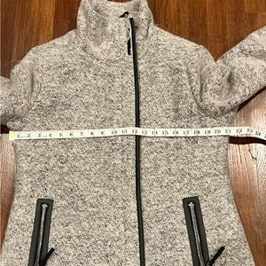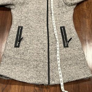 Cute Mid-weight asymmetrical zipper front with faux-leather trim. Zip pockets at hips with faux-leather trim,