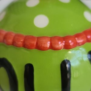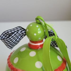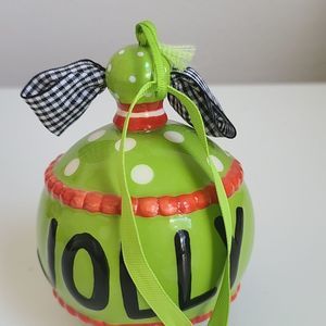 Beautiful ceramic jingle bell, bright green color with orange, white and black accents.