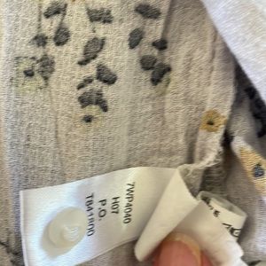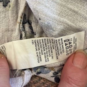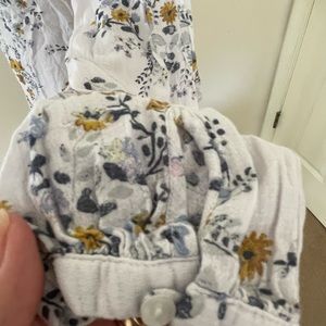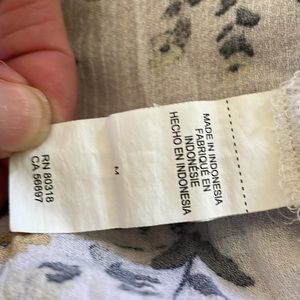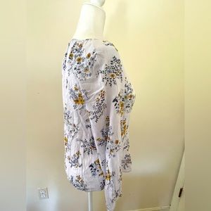 Lucky brand medium peasant blouse in a floral pattern, raglan sleeves with one button closure at cuffs. 3 button closure with keyhole and tie in the front. True to size. Item is in good used condition with some pulls.