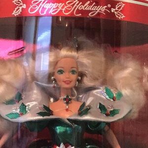 BEAUTIFUL HAPPY HOLIDAYS BARBIE. SPECIAL EDITION 1995. WRAPPED IN RICH EMERALD GREEN SATIN WITH TWINKLING HOLLY BERRIES AND A GRAND VICTORIAN STYLE COLLAR. THE BACK OF THE BOX TAPE UNGLUED A BIT BUT BOX ALWAYS SEALED. NEVER OPENED. DOLL NEVER CAME OUT OF BOX. PERFECT CONDITION