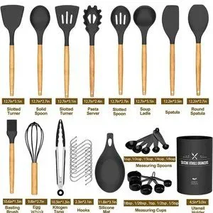 [ Silicone 33 Cooking Utensils] This cooking set includes all cooking utensils, so you do not need to buy them individually. Silicone cooking utensils set includes Slotted turner, solid spoon, pasta server, slotted spoon, soap ladle, basting brush, egg whisk, kitchen tong, hooks, silicone mat, measuring cups and spoons, holder. Fulfill your kitchen needs, give you more opportunity to enjoy cooking.
