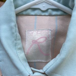 Vintage Roper stripped Western button shirt. Two front pockets and button cuffs. Pale peach color with light blue stripes, collar, and pockets. Small stain in collar shown in last picture. Armpit to armpit 20.5” and 24.5” long. Size tag missing, but based off measurements is best fit for size medium to large. Please read measurements carefully before purchasing.