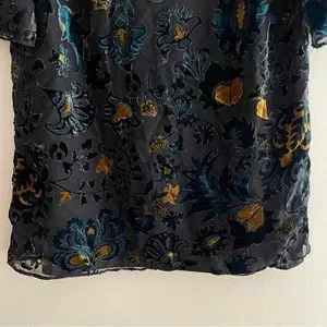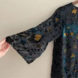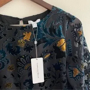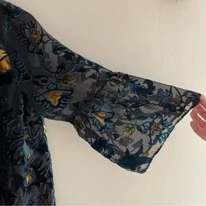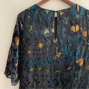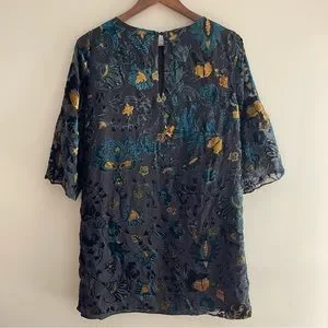 Brand new with tag! Suede-like material on some of the patterns and the sleeves are mildly sheer. Slight trumpet sleeve and keyhole button in the back.