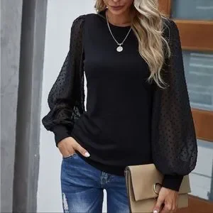 Boho Black Swiss Dot Balloon Sleeve Top S M L XL, polyester blend, ships in 7-8 days