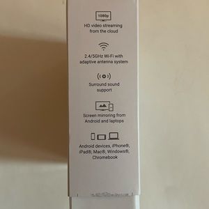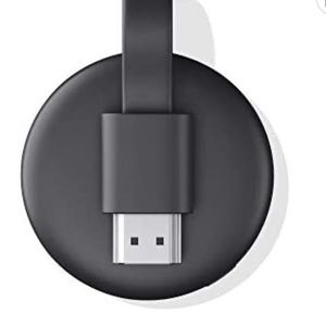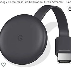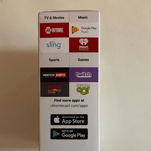 Chromecast streaming device by Google. Get rid of high cable bill and stream with using the internet. Simple setup! Brand new in original packaging. Never used. Box opened for photos. Weighs less than 2 ounces.