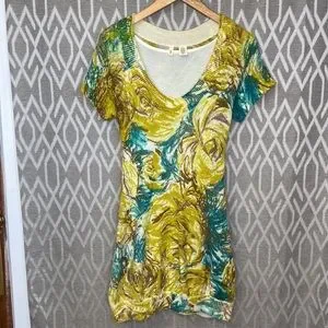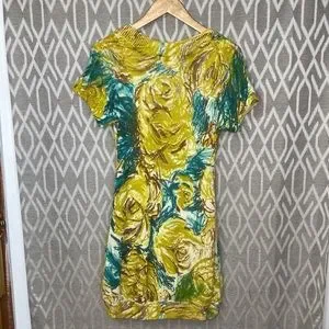 Moth Short Sleeve Scoop Neck Sweater Dress Lined Tank Dress Yellow and green Floral Motif