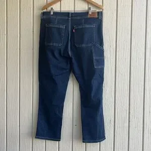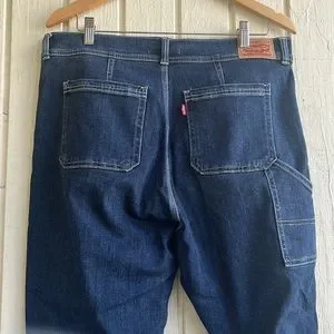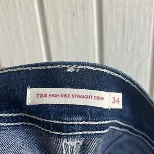 Levi’s 724 High Rise Straight Crop Jeans. These jeans are a really cool dark wash with light contrast stitching. They feature carpenter pockets in the back and a double button and zip closure. They have a fair amount of stretch and are 92% cotton, 6% polyester, 2% elastane. In gently used preowned condition.