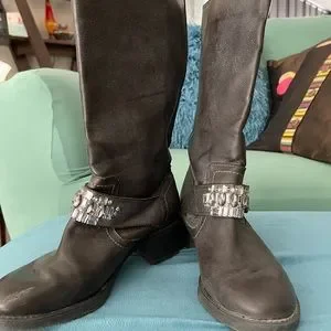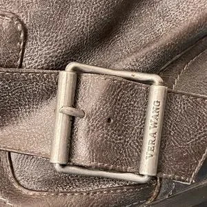Man made upper, 1.5” heel, 11” shaft, bejeweled front strap. Dark brown with a “dusty” patina. “Very Wang” on buckles. GUC