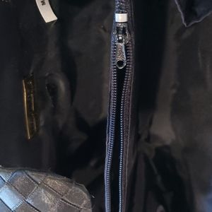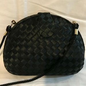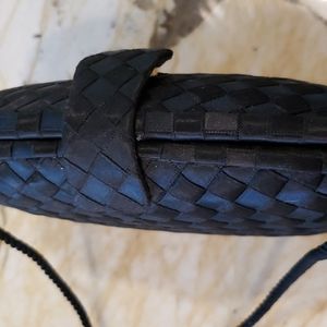 Black satin, never used. can be used as a clutch, tho it has a strap, strap is 22 inches