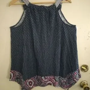 VNeck and Navy Blue and White Striped Shoulder Straps.