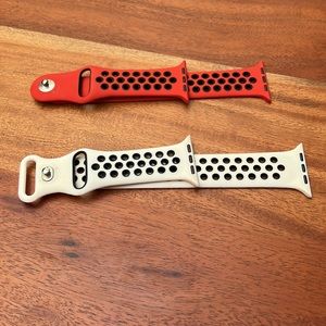 Soft silicone, fits 38-49mm Apple Watch faces. Solid orange and solid beige, white with black rimmed holes, red with black rimmed holes. All in excellent used condition.