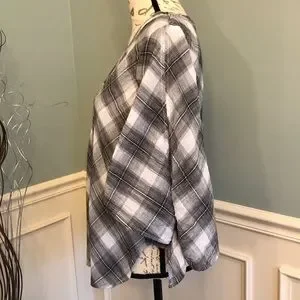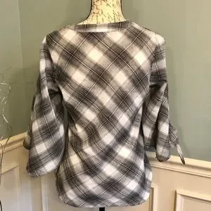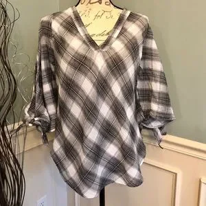 The top is so light and airy! A bias-cut, black and white plaid pattern brings graphic pop to this airy crinkled cotton top, while ties at the statement sleeves create effortless movement. V-neck with three-quarter bell sleeves with slits and tie cuffs. Excellent condition. Smoke free, pet free home.