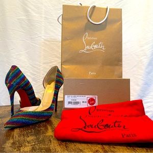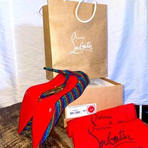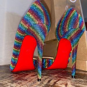 These shoes are amazing. Come with everything pictured, including a brand bag for each heel, the box, and the bag they were purchased with. Worn twice, once to Pride and once for a Boudoir photo shoot. Bottoms are pictured and very, very slightly scuffed. A shoe repair can easily fix this and you’d have brand new Rainbow Louboutins! Price is firm, not selling anywhere but through the app.