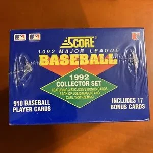This 1992 Score factory sealed MLB collector set includes 910 player cards and includes 17 bonus cards. Features 3 exclusive bonus cards each of Joe DiMaggio and Carl Yastrzemski.