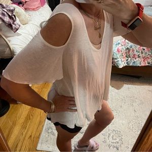 Free People cold shoulder sleeve top •cream cold sleeve top • like new used preowned condition • slightly asymmetrical hem •Cotton blend