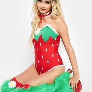 Fruit Friend Strawberry Costume served with a side of sass! This farm fresh costume set includes a strapless tbodysuit design like a strawberry, a spiked green stem hat, furry leg warmers with daisy accents, and a matching strawberry purse and lace choker.