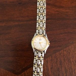 Stainless and gold. Classic ladies watch. Needs a battery.