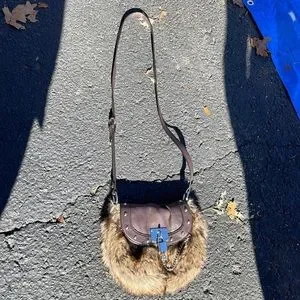 NINE WEST faux fur cross body purse. Flap closure and silver locket detail
