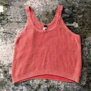 Coral sweater tank top by We the Free. Has a cute sandblasted look to it, and length is about at my hips. Oversized small fits like a medium/large. Ribbed detailing and side slits. Great pre-owned condition with no snags!