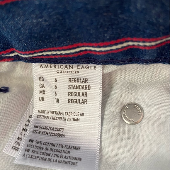 American Eagle high rise mini skirt. Denim with red and white stripes. Super stretch with fringe hem. Size 6, approximate measurement 15” length