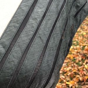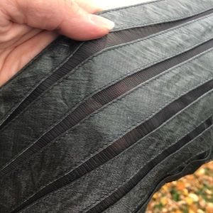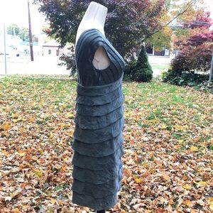 Ruffle layered evening dress, preloved in very good condition. Sexy and fitted. The exact color was hard to capture, it is a true shimmery olive green. The bottom is reminiscent of a mermaid. The top is lined with mesh between the the diagonal stripes, as shown in pic. The skirt is lined with a silky gray lining. Fabric has an all over sheen. Zipper in back.