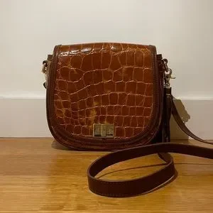 Featured in Tan Gustavo, our most luxurious Italian leather embossed with an all-over flat croc print. Genuine leather. Measurements: 8.8″ W 7.5″ H 3″ D (Small)