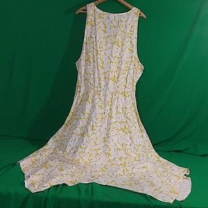 Fun and flowy hi-low hem dress. White background with butter, yellow, and very soft pink colors. Looks super cute with a jean jacket! Only worn once!