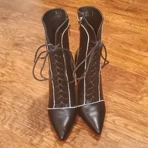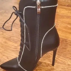 Stunning black, pointed toe, stiletto booties with rhinestone trim, lace up front, and side zipper. 4 inches high.