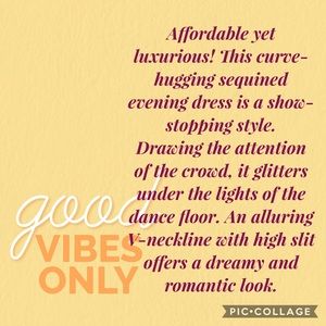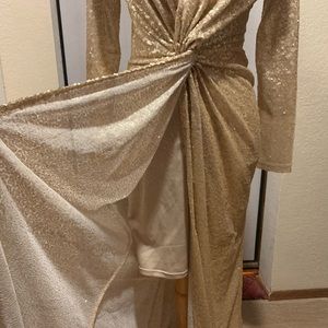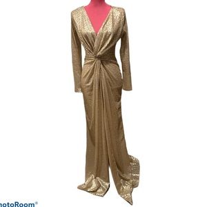 Va va voom make an entry in this beautiful eye catching gala dress with millions of gold colored tiny sequins, worn once, partial lined,Trumpet/Mermaid V-neck Floor-Length Sequined Evening Dress With Open skirt Front, long sleeve, knotted front waist for a flattering figure, the color is like a matte gold not as shiny as gold, Affordable yet luxurious! This curve-hugging sequined evening dress is a show-stopping style.Drawing the attention of the crowd, it glitters under the lights of t dance floor, smoke pets free home, fast shipping, color may vary by device screen and light, approx length: 55” armpit to hem, sleeve: 24.5