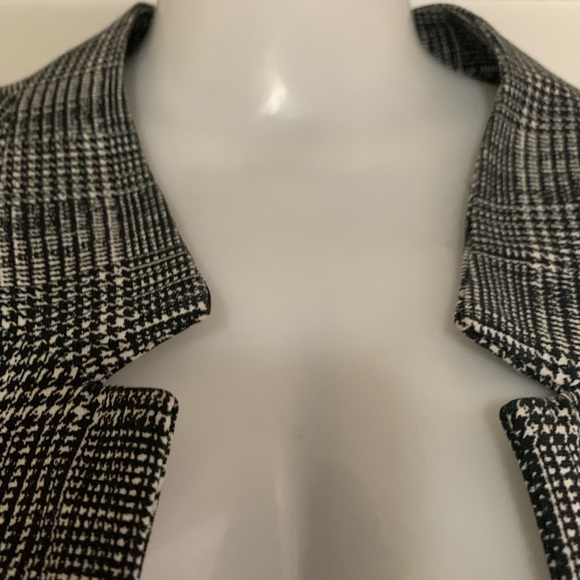 The beautiful long black and white blazer can be dressed up or down, with tights, dress pants or a skirt! Very becoming, there’s plenty of stretch in the fabric and is SO comfortable. The material wears like iron, doesn’t pill, and is great for any season. Mandarin style collar, two hook and eye buttons at front.