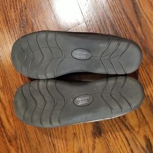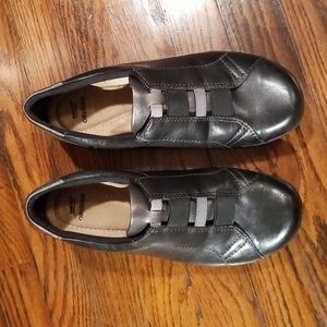 Excellent condition loafers in black and metallic gray. Elastic straps keep shoes secure and comfortable.
