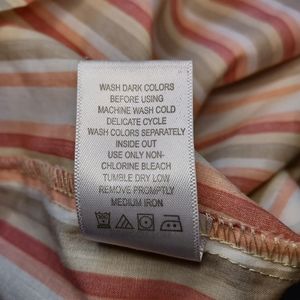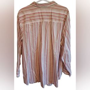 Classic button-down striped blouse in colors of white, tan, and coral. Wrist cuff has 2 buttons so you can adjust the fit. Shirt length is 31"; sleeve length is 24".