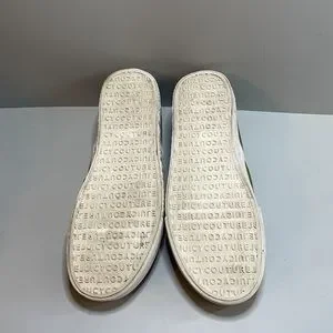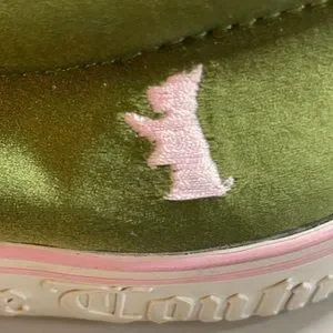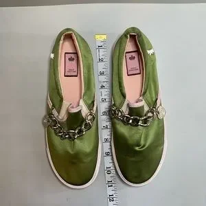 Juicy Couture green satin slip on shoes with pink trim and gold chain. No size on shoe. Fits like 10-10.5. See photo with measuring tape.