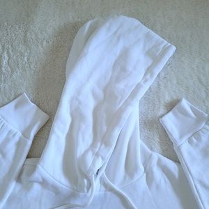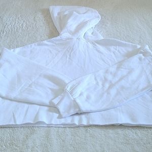 Cropped style, hood with drawstring, long sleeves with banded cuffs, straight raw hem, incredibly soft and cozy material