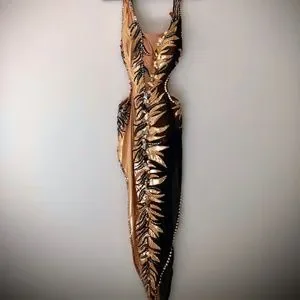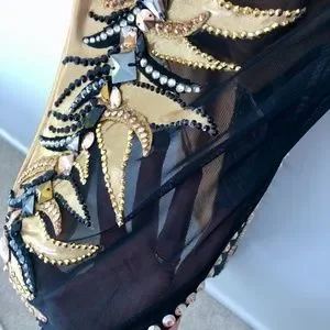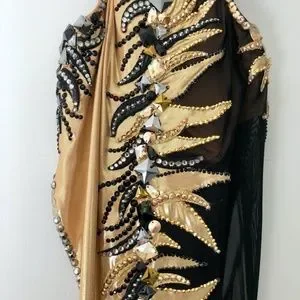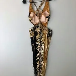 Beautiful metallic gold and sheer black ballroom competition dress. Can be used for Latin and Rhythm styles. Dress can fit sizes 2-6. Has only been worn 3 times and recently dry-cleaned. Owner has retired from ballroom dancing competition and would like to pass the dress along to the next generation of ballroom dancers!