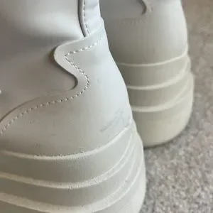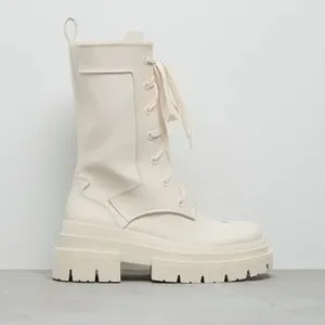 these are a beautiful beige-off white shade. they lace up, but you don’t have to re-tie them as they have a convenient zip on the inside of leg. Only worn once. These are a size 371/2 but they fit me like a true size 8.