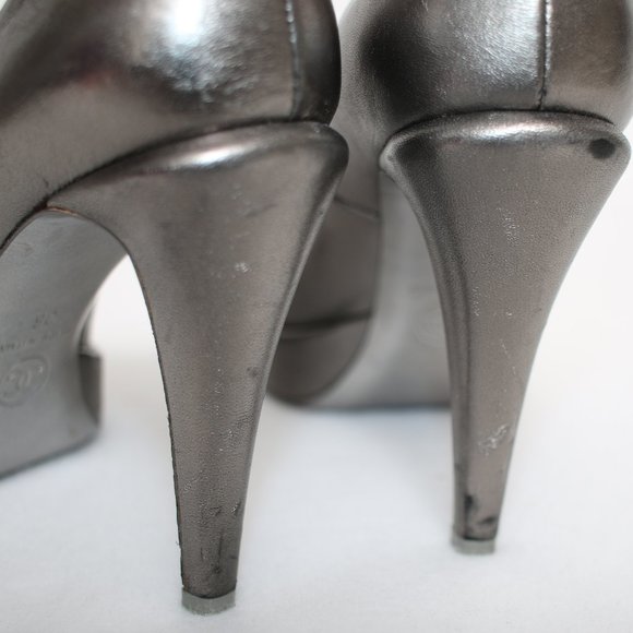 CHANEL Camellia Metallic Silver Leather Pumps Sz 36