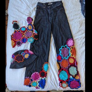 Rainbow floral crochet set, great fit festivals or concerts! Jeans are converted pair of Levi's, size 27 ribcage cut, long. Top is a small. Selling individually or as a full set at a discount!
