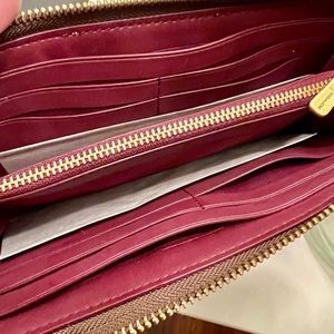 The iconic Coach monogram motif on coated canvas distinguishes a slim zip-around wallet with calfskin leather trim. A spacious, accordioned interior provides plenty of room and pockets for storing your cards and cash.
