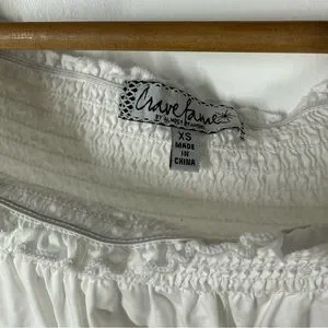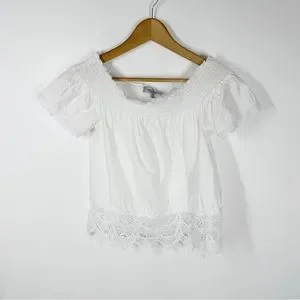Almost Famous Womens White Lace Trimmed Blouse. Short Sleeve. Elastic around neck so can be worn on or Off Shoulder. Chest 17” length 21”. Size XS. Excellent condition.