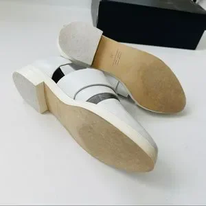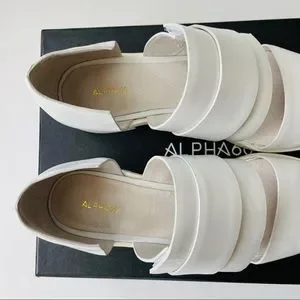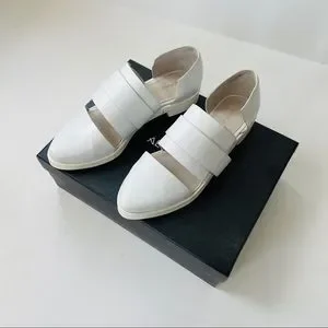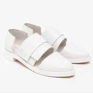 From Alpha60, the Kuri Pointed Derby Velcro strap sandal in white size EU 38. Leather. Pointed toe. 1” heel, 10” long outersole. Excellent pre-owned condition, only worn a couple of times. I am a US 8 and these fit me.