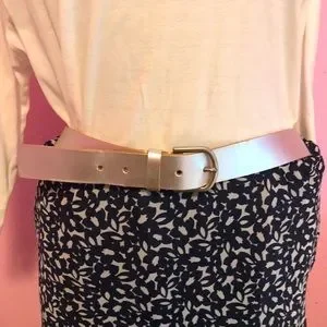 Metallic Silver Fossil Belt. Buckle also silver color. In excellent preowned condition. It would fit a 40 to 44 inch waist. Belt total length is 48 inches. Not marked genuine leather but is leather that has been painted-dyed silver on face & a tan on inside.