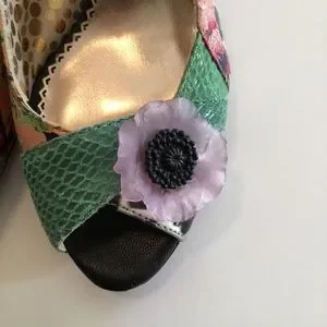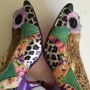 Cute with purple 3” heel. Mix of prints and colors make them eye catching. Leather upper and padded foot bed. One small ding on heel and scuff marks on inside of left shoe. Not noticeable due to color pattern. Small area on heel footbed. See last pics.