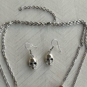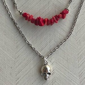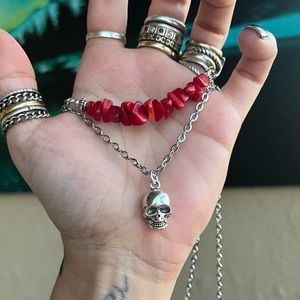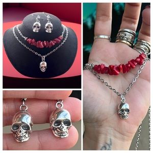 Skull red coral set ( Necklace + matching earrings ) Double layer necklace . Genuine red coral chips β¨ Stainless steel chains & clasp . First layer is 15 inch , second is 17 inch ( But it also has a two inch extention on the back to adjust it longuer ) But If you need a different size lmk ( handmade by me π I can adjust )Silver plated skull charms . Earring post are also stainless steel (Allergy free / nickel free ) TAGS : Boho / bohemian / boho chic / celt / celtic / viking / irish / ireland / st patrickβs day / nordic / trisquel / triquetra / charmed / fairy / witch / xmas / Rock / rocker / rock chic / fairy / mermaid / goth / gothic / gemstones / gem / gems / natural healing stones and crystals / crytals collector / gypsie / hippie / chokers / gift / silver choker . Hand crafted / cute sets / handcrafted / designer / trendy / fashionable / luxury / elegant / dainty / gift / every day jewelry / festival / medieval fair / antique / elf / cosplay / biker / red stones / sugar skulls / mexican skulls / day of the dead / halloween