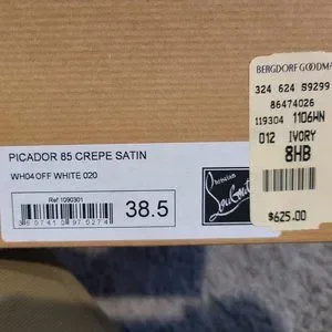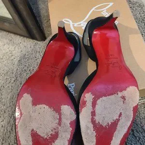 Excellent condition Christian Louboutin sling back heels, originally ivory but dyed black, crepe satin, red under heel in great condition (has rubbed off per pics some under ball of foot). Heels in excellent condition also. See pics. Size 38.5. Style is Picador 85. Comes with original box and dust cover. Purchased for over almost 700 at Bergdorf.